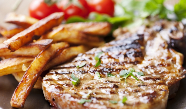 Пържолите се запържват в половината от мазнината и се поръсват с черен пипер и сол. Заливат се с виното и след няколко минути се свалят от котлона. В останалата мазнина се запържват нарязаните на тън...