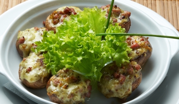 Махате пънчетата и слагате парченце масло, сол, черен пипер, парченца месо, зеленчук (по желание) и по-голямо парче кашкавал в тази последователност в шапчиците на гъбите. Намазвате тавата с масло и...