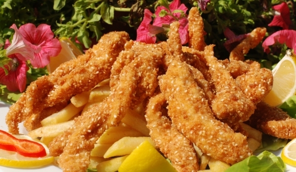 Нарежете пилешкото на тънки и дълги хапки и ги мариновайте за един час в малко соев сос, зехтин, черен пипер и лимонов сок. След това ги отцеждайте, овалвайте в галета, разбити яйца и пак галета и ги...