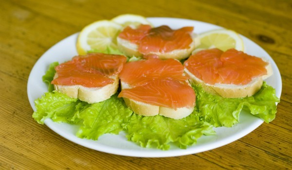Взимате филийка от черния хляб, намазвате я с масло, режете филийката един път на дължина и два пъти на ширина, след което слагате върху всяко парченце намазан хляб малко парченце сьомга и едно малко...
