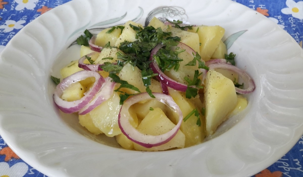 Картофите се обелват, варят се и се режат на четвъртинки. Приготвя се дресинг, като се смесят оцетът, солта, олиото и подправките. С дресинга се заливат топлите картофи и се разбъркват. Лукът се реж...