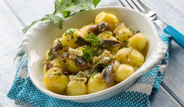 Картофите се обелват и нарязват. Сваряват се и се посоляват. Лукът се нарязва на кръгчета и в купа започват да се редят пластове картофи, аншоа и лук. Поръсва се с магданоз и се залива с дресинг, при...