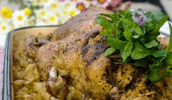 Патицата се измива и се пробожда по кожата на няколко места с нож. Ябълката се режете на парчета и поръсва с 1 и 1/2 ч.л. градински чай. Натъпква се във вътрешността на патицата. Патицата се поръсва...