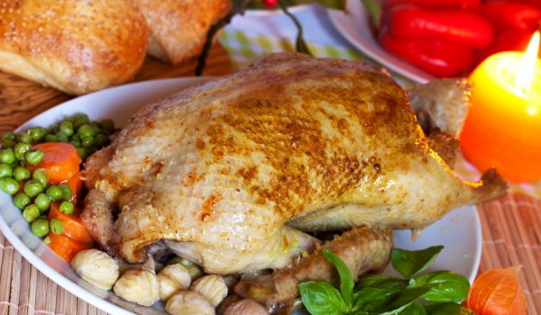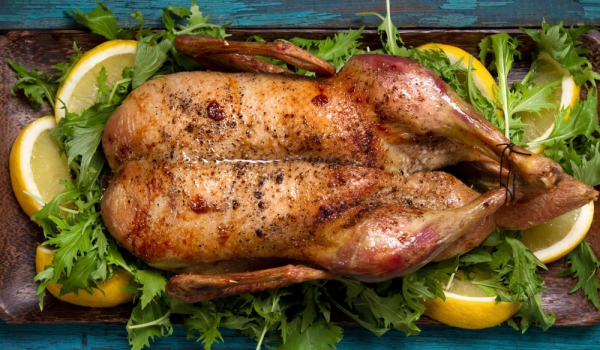 Почистете добре патицата, отделете дреболийките й и ги сложете леко да се сварят във вряща вода с 1 с.л. оцет. След това ги отцедете и ги накълцайте дребно. Патицата натъркайте със сол и черен пипер...