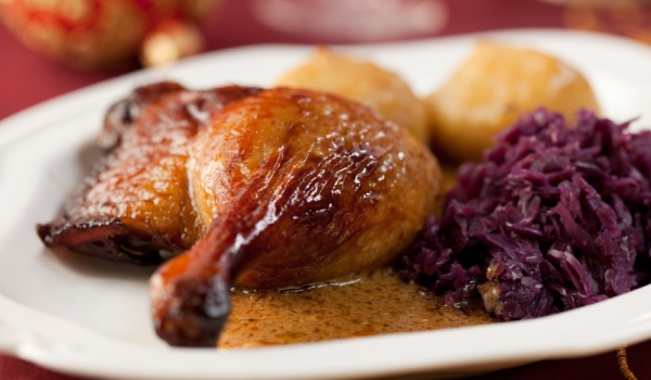 Нарежете на порции 1 дива патица и запържете патешкото от двете страни в сгорещена мазнина. Накълцайте зелето и го намачкайте със сол, след което го поръсете и объркайте с червения пипер и ким. Добав...