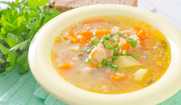 Сложете бульона да заври в тенджера, заедно с пилешките гърди, нарязани на ситно. Когато заври, се добавете постепенно ориза, като се бърка постоянно. Намалете температурата и оставете супата да къкри...